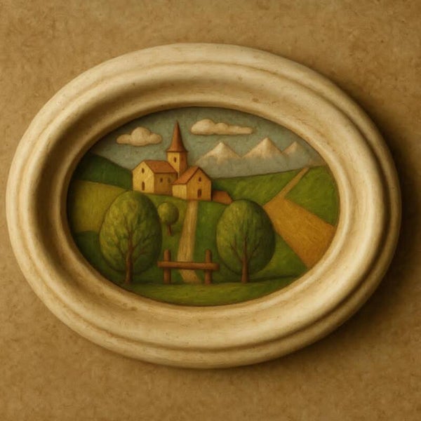 petite cadre ovlale représentant un paysage de campagne avec église en plâtre blanc